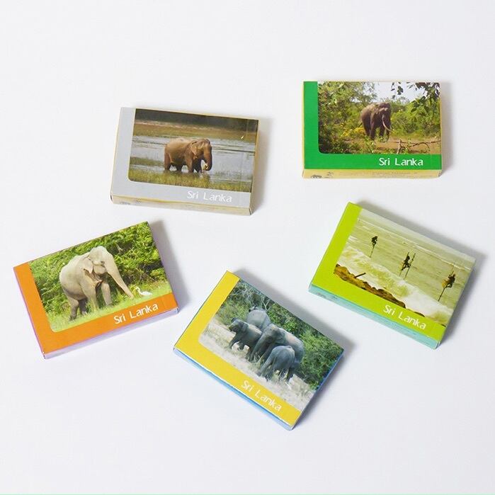 スリランカの伝統漁法の光景や、象の写真がプリントされたトランプです。